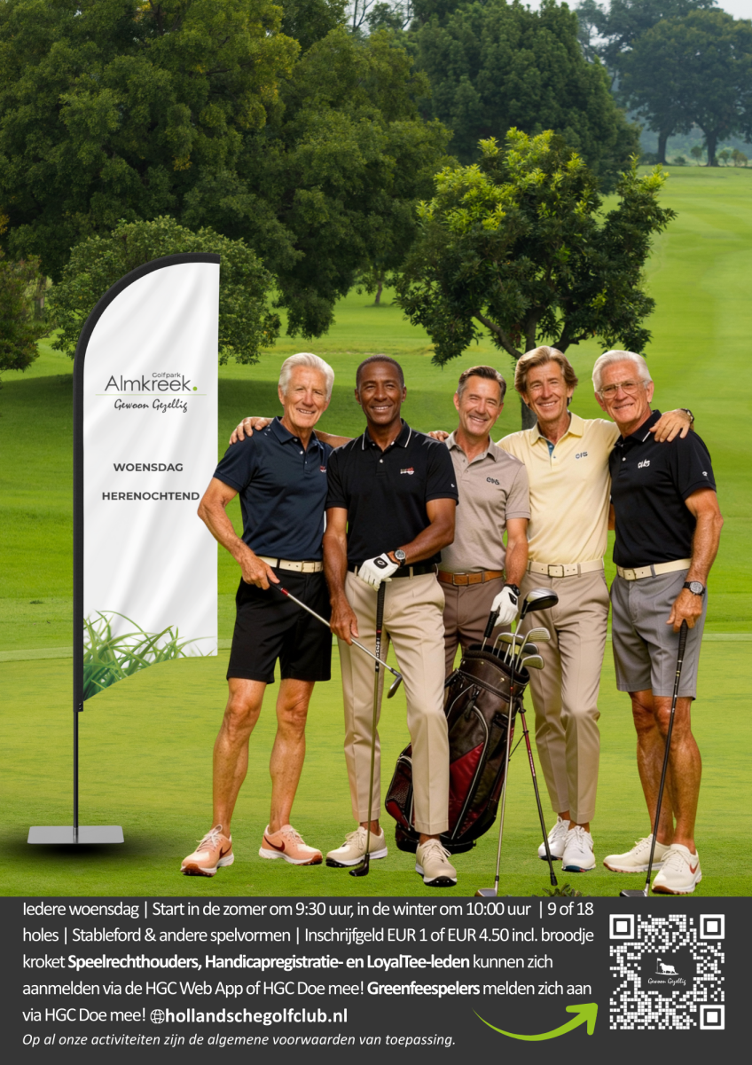 Woensdag – HerenochtendDeze ochtend is bedoeld als sociaal gebeuren waarbij we ongedwongen en gezellig samen zijn met golf als serieuze bindende factor. Vanwege het sociale karakter van deze ochtend hebben we dan ook graag dat iedereen op tijd aanwezig is en blijft totdat het broodje kroket genuttigd is.